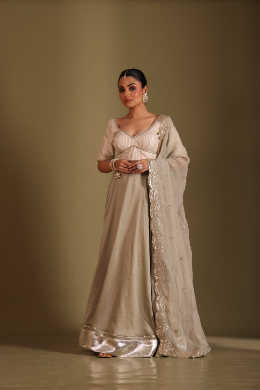 Noorika Ivory Brocade Blouse with Sage Silk Lehenga and dupatta- set of 3