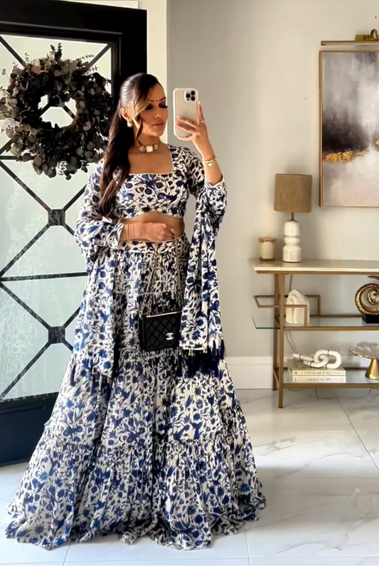 Gulzar Blue printed Blouse with Lehenga and dupatta- set of 3