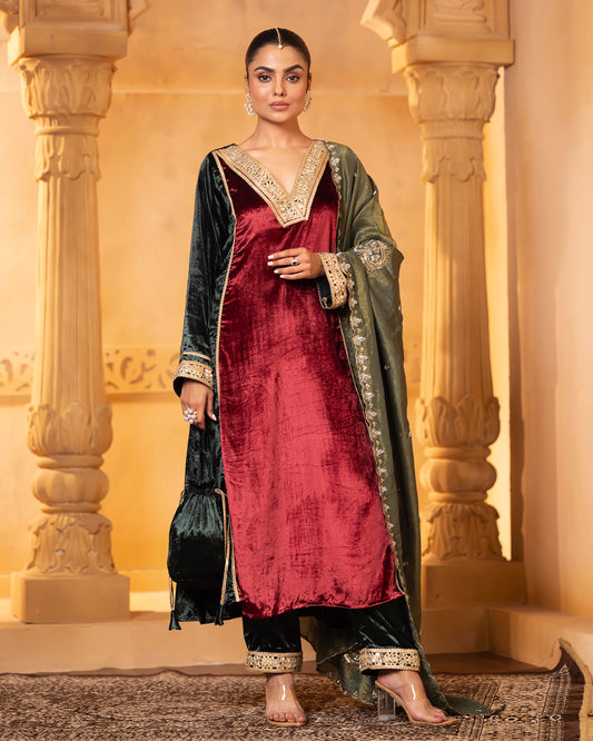 Mehru Emerald Maroon Silk Velvet A-Line Kurta with Pant and Dupatta - Set of 3