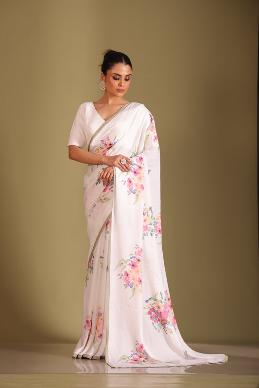 Gulzar White Floral Printed Saree and Blouse- set of 3