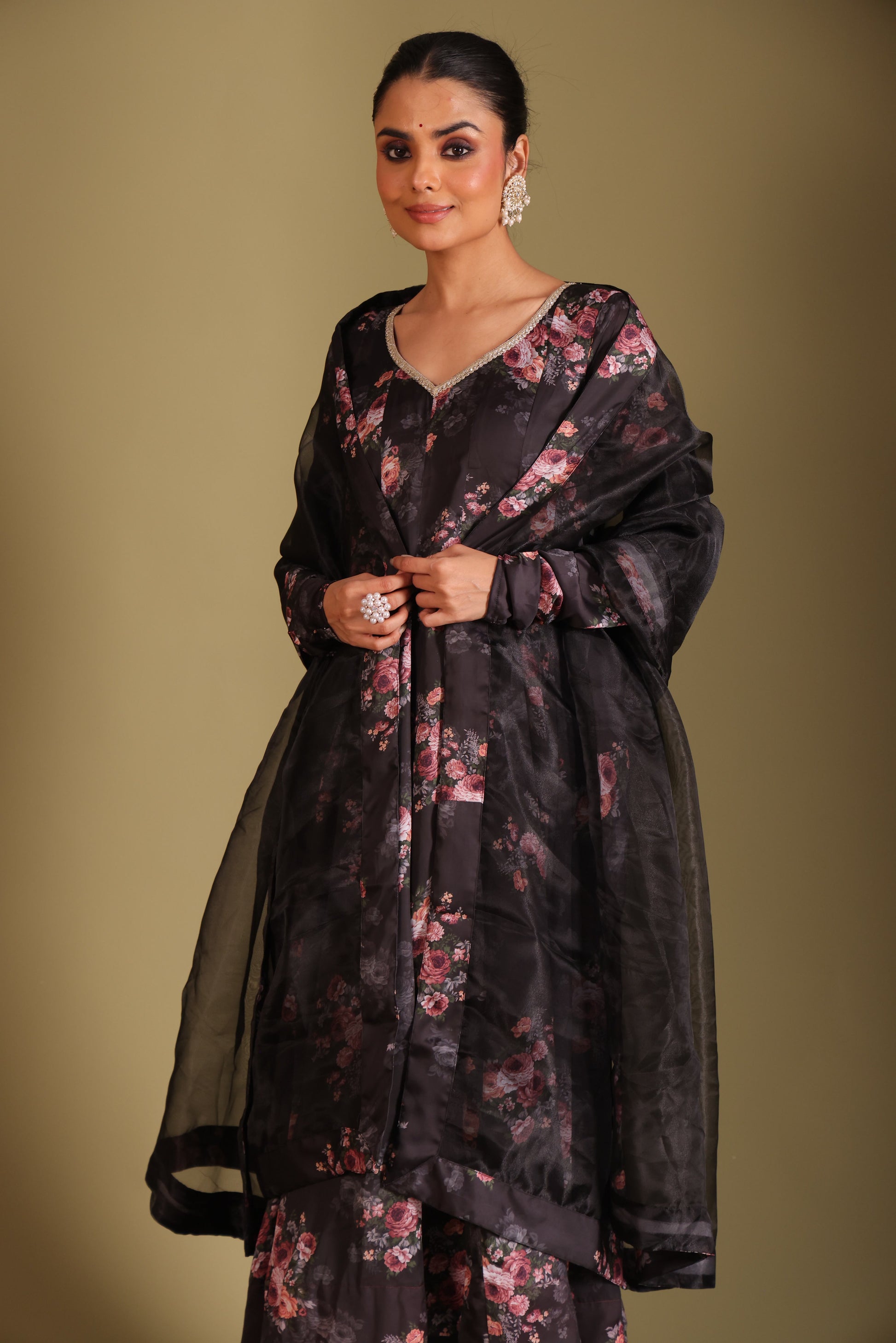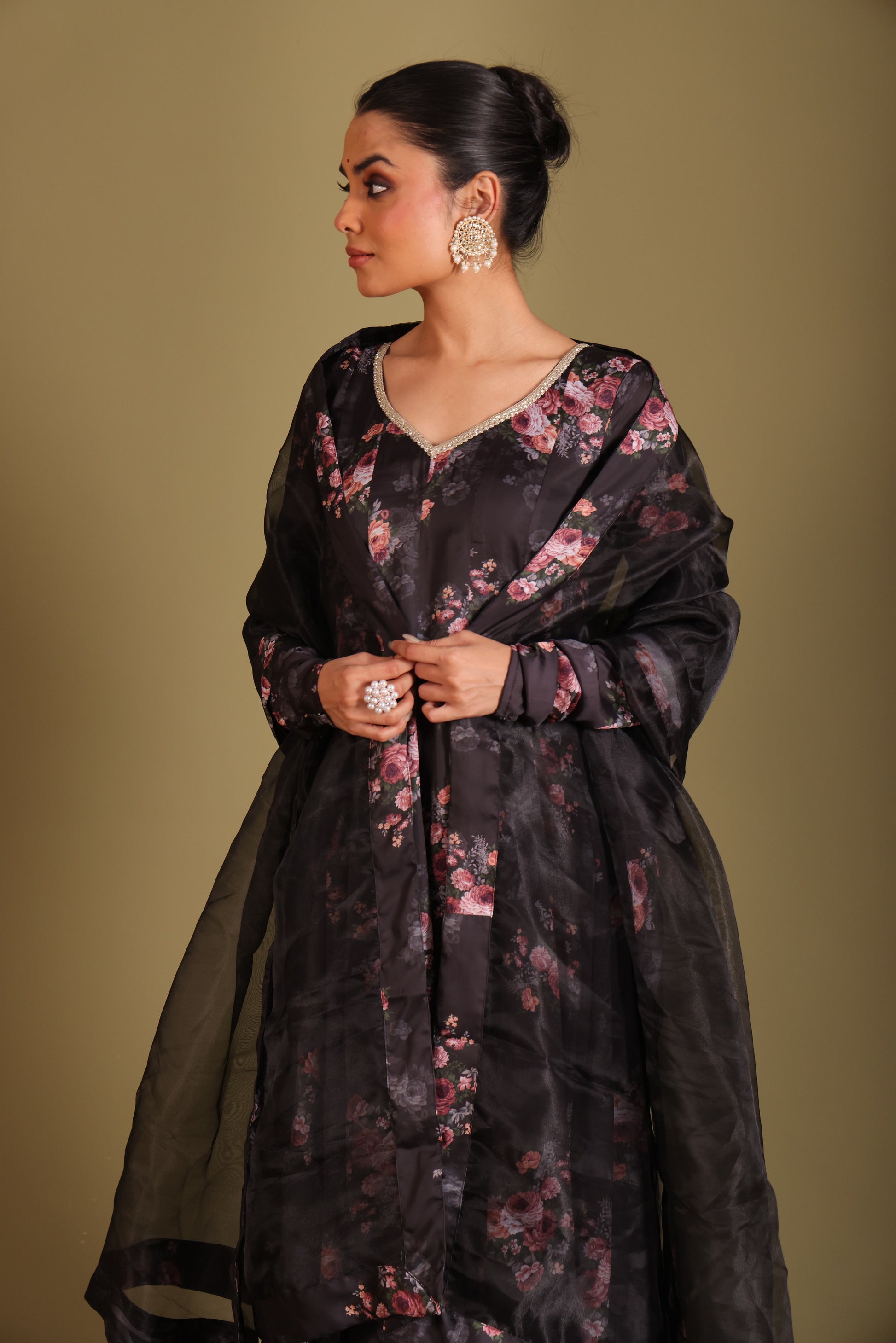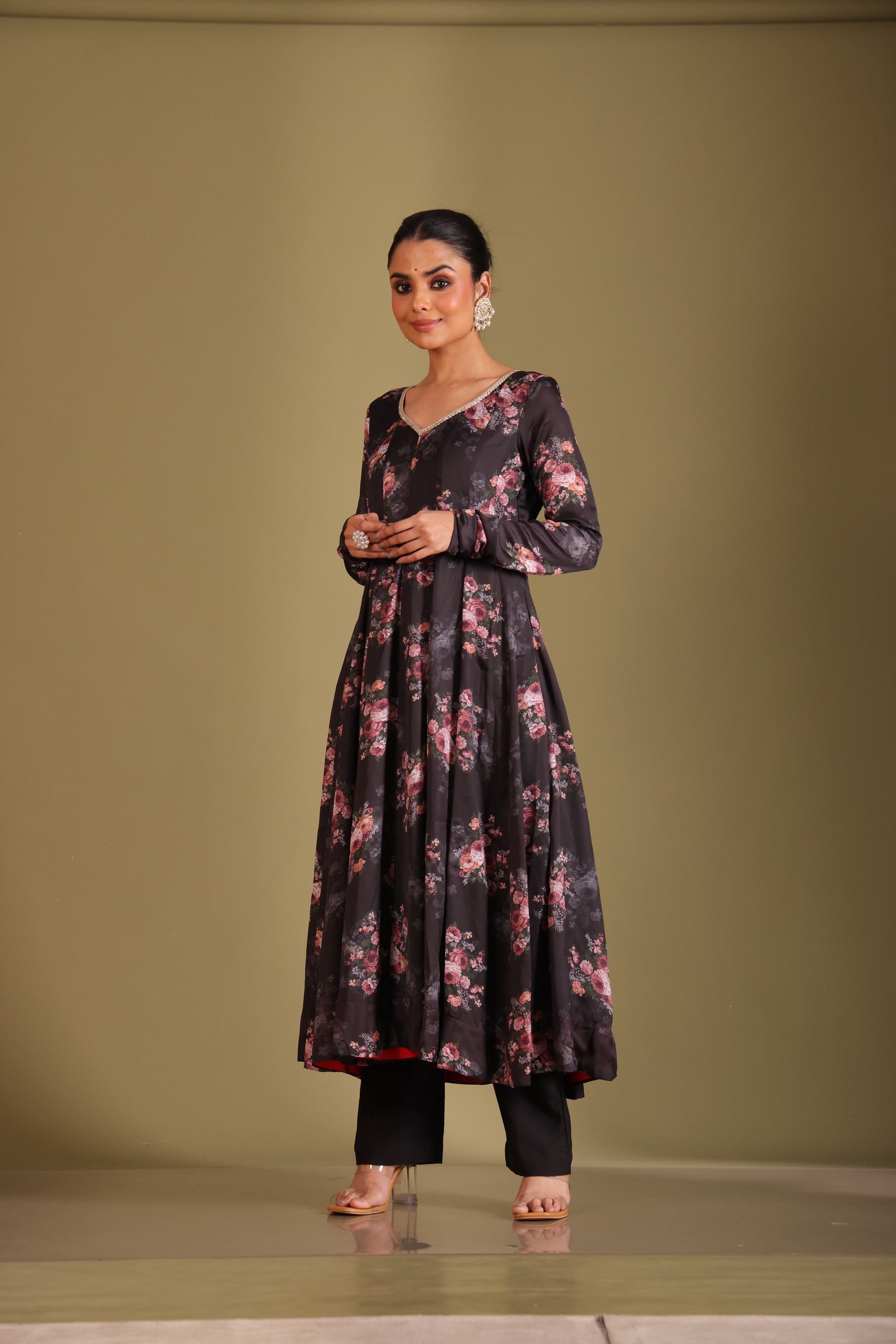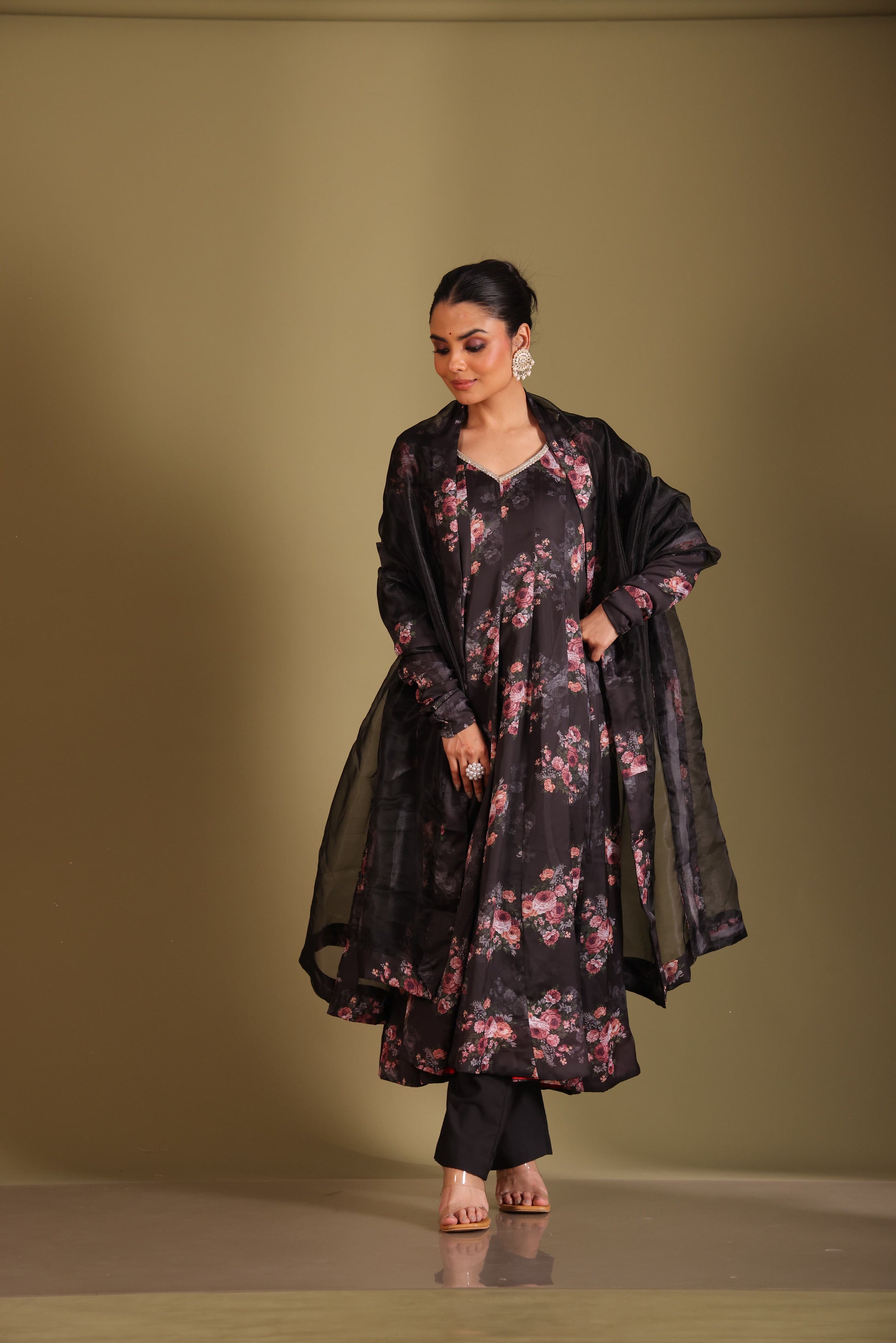 Gulzar Black Floral printed anarkali with pant and dupatta- set of 3