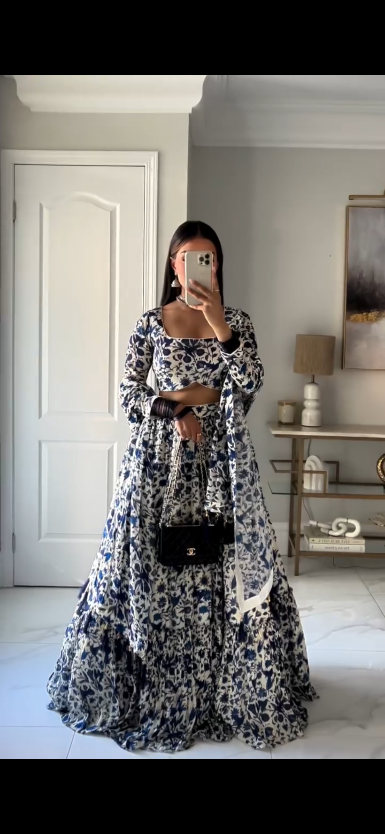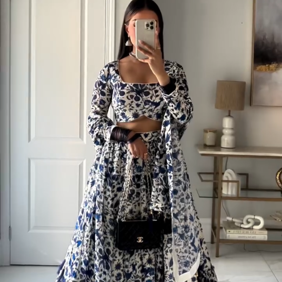 The blue and white printed blouse features a classic square neckline and full sleeves, giving it a timeless, elegant appeal. It is paired with a voluminous silk crepe lehenga adorned with intricate digital floral prints, creating a statement silhouette. The look is completed with a soft organza dupatta, perfectly complementing the ensemble with its fluid drape and modern charm.