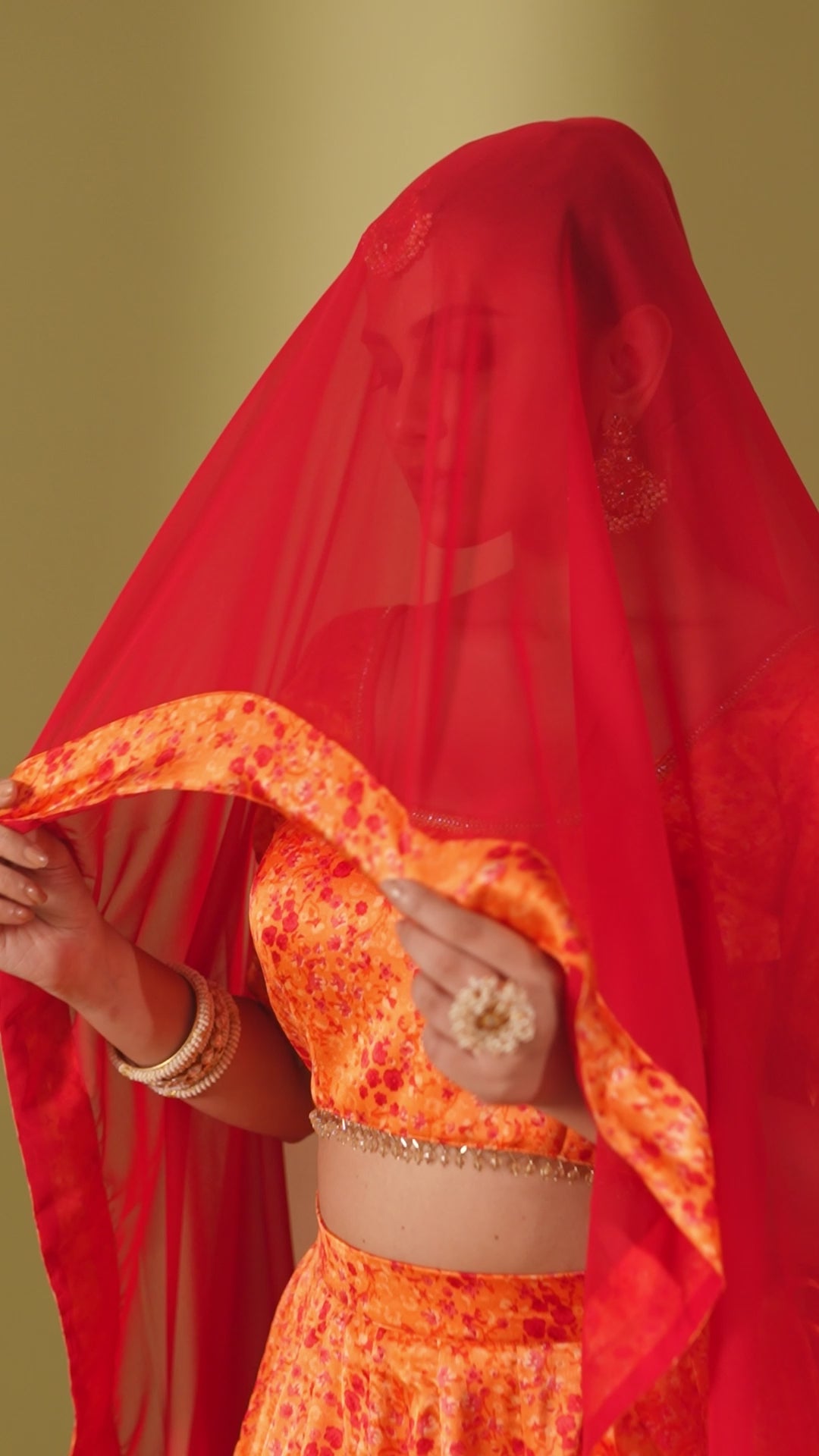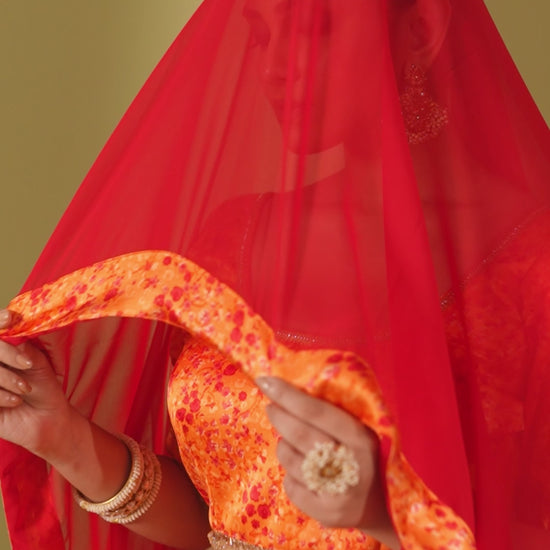 The blouse features a vibrant orange floral print in soft satin georgette, perfectly complementing the flowy kalidar lehenga with cancan for added volume.