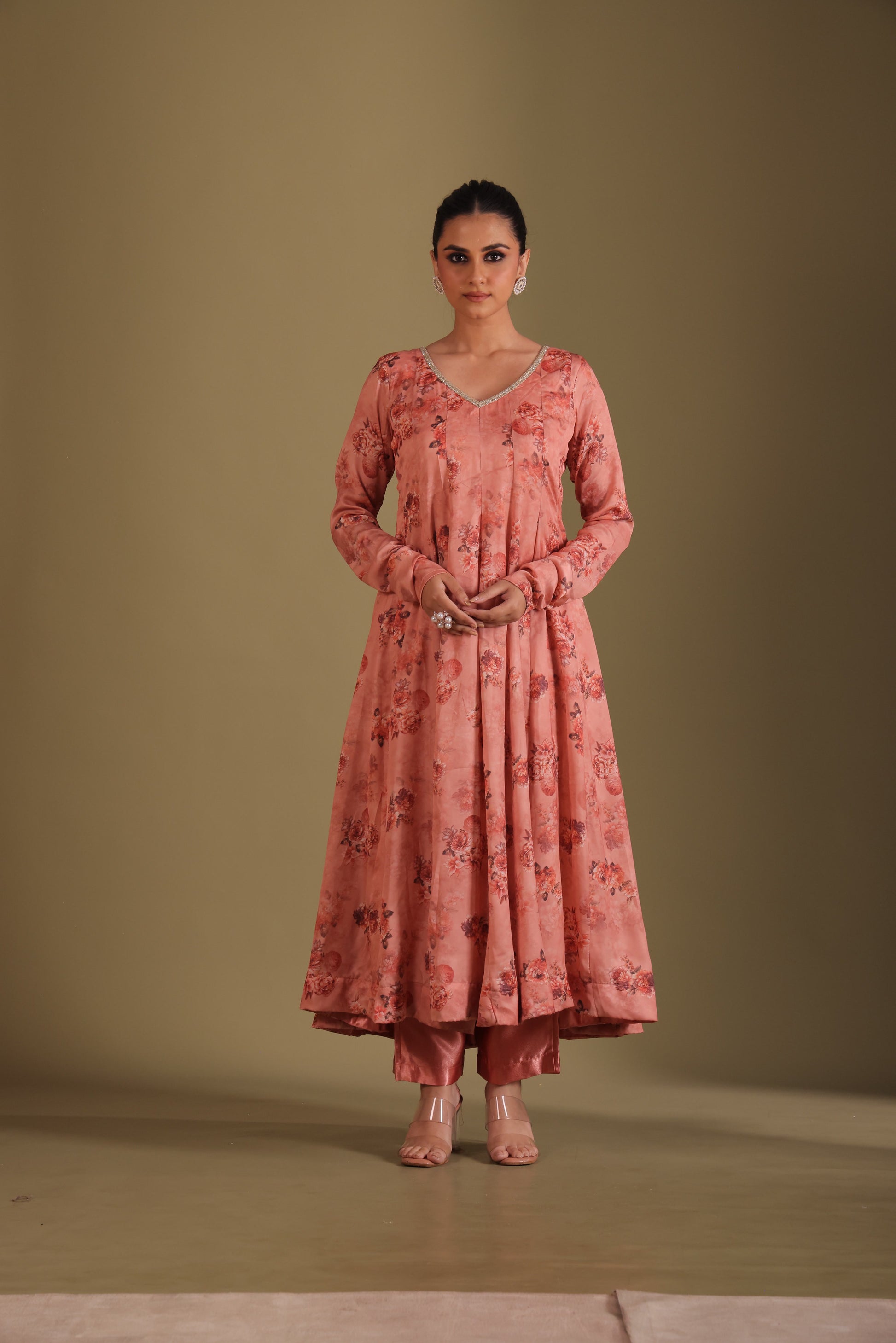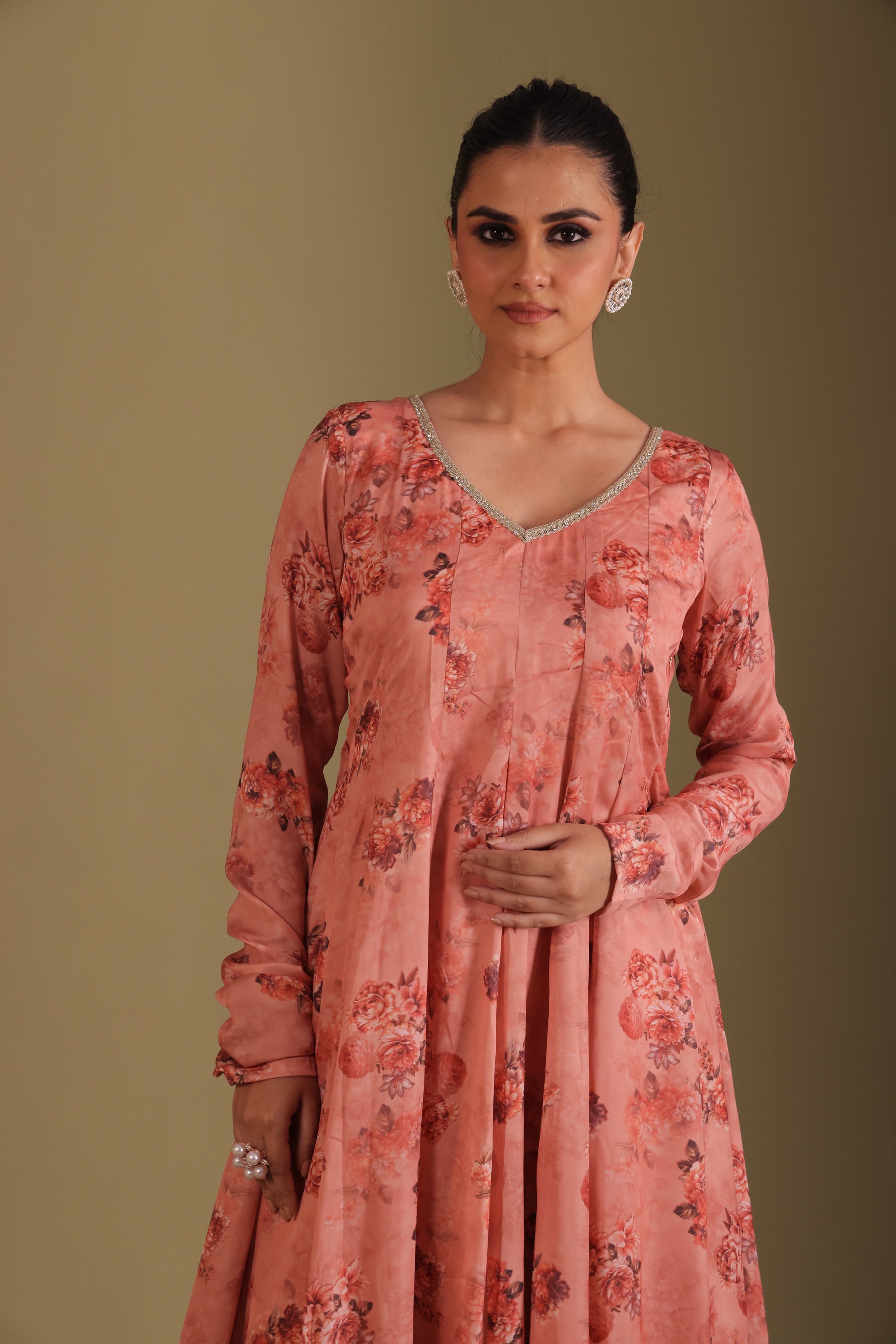 Gulzar Peach printed Anarkali with Pant and dupatta- set of 3