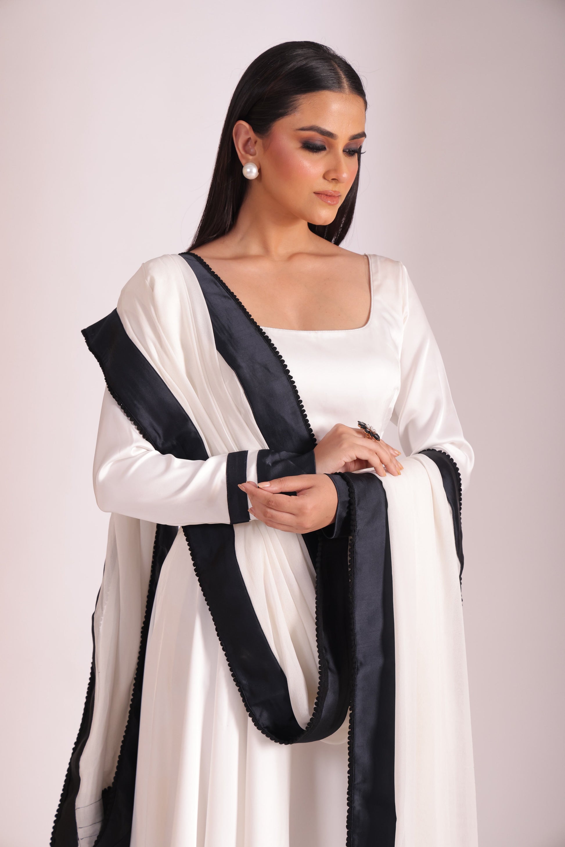 This three piece set includes Anarkali, Chooridar and dupatta White satin round neckline anarkali with black satin border in the hem and sleeves. White chooridar. White georgette dupatta with black satin border with floral black lace finishings.