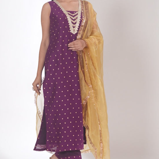This set includes a Wine Zari Chanderi Kurta, Monga Silk Pants, and Organza Dupatta.