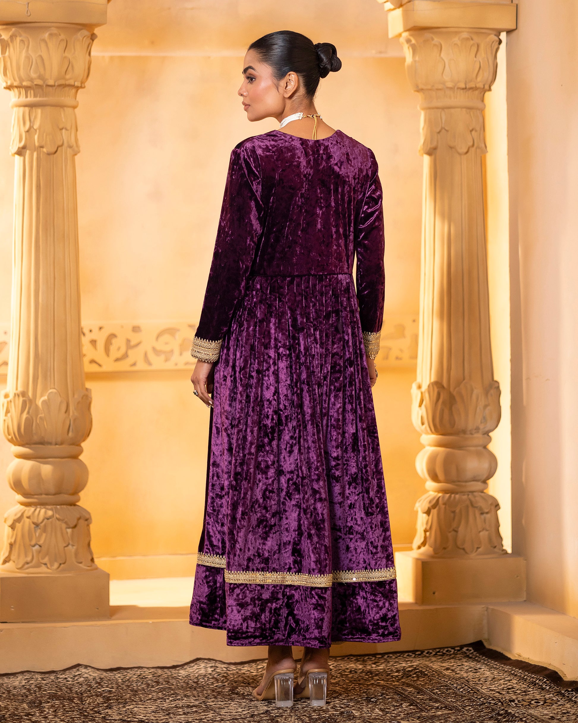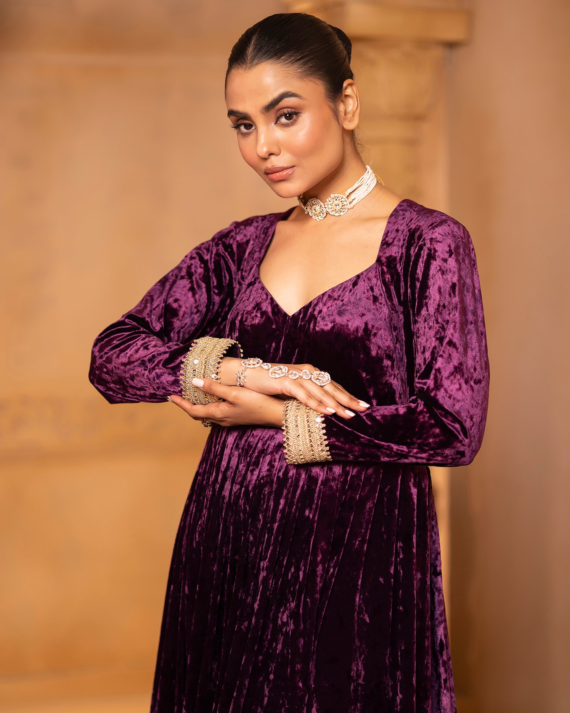 FABRIC USED: Anarkali- Silk velvet, Yoke lining- Crepe, Pant- Silk velvet,