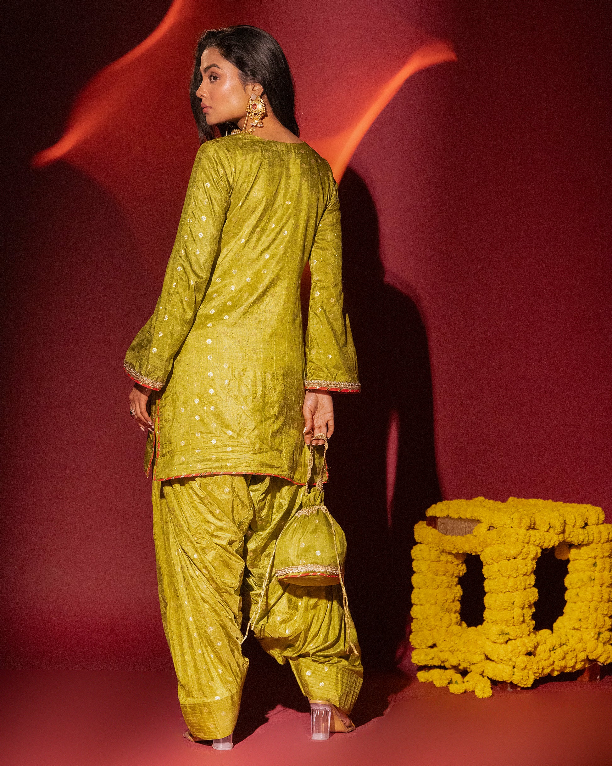 Crafted in a refreshing pista green hue, this kurta and salwar set is tailored in luxurious dola silk, featuring delicate woven motifs that add subtle texture and understated charm. The straight-cut kurta offers a graceful silhouette, paired with a softly draped salwar for effortless comfort and movement.