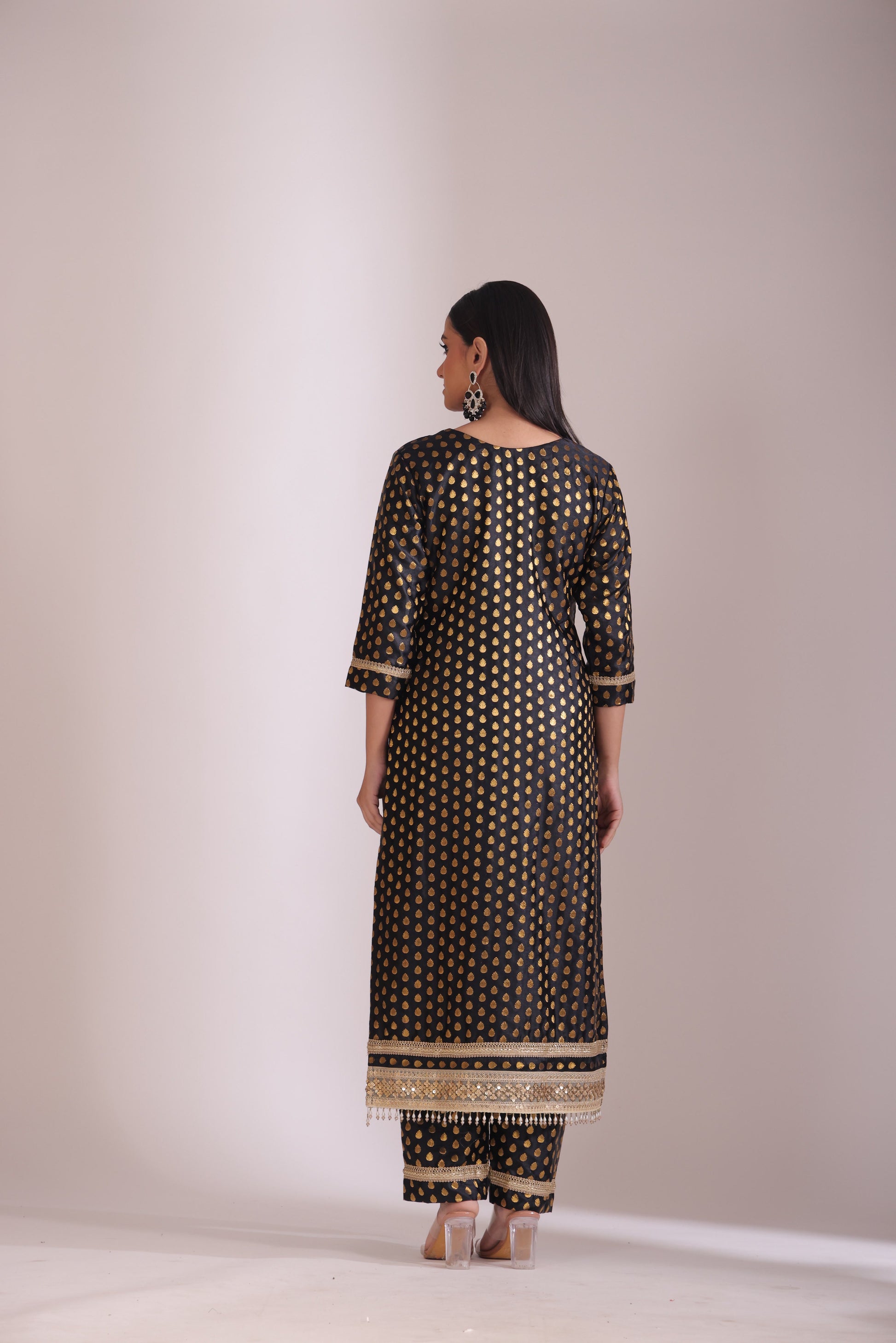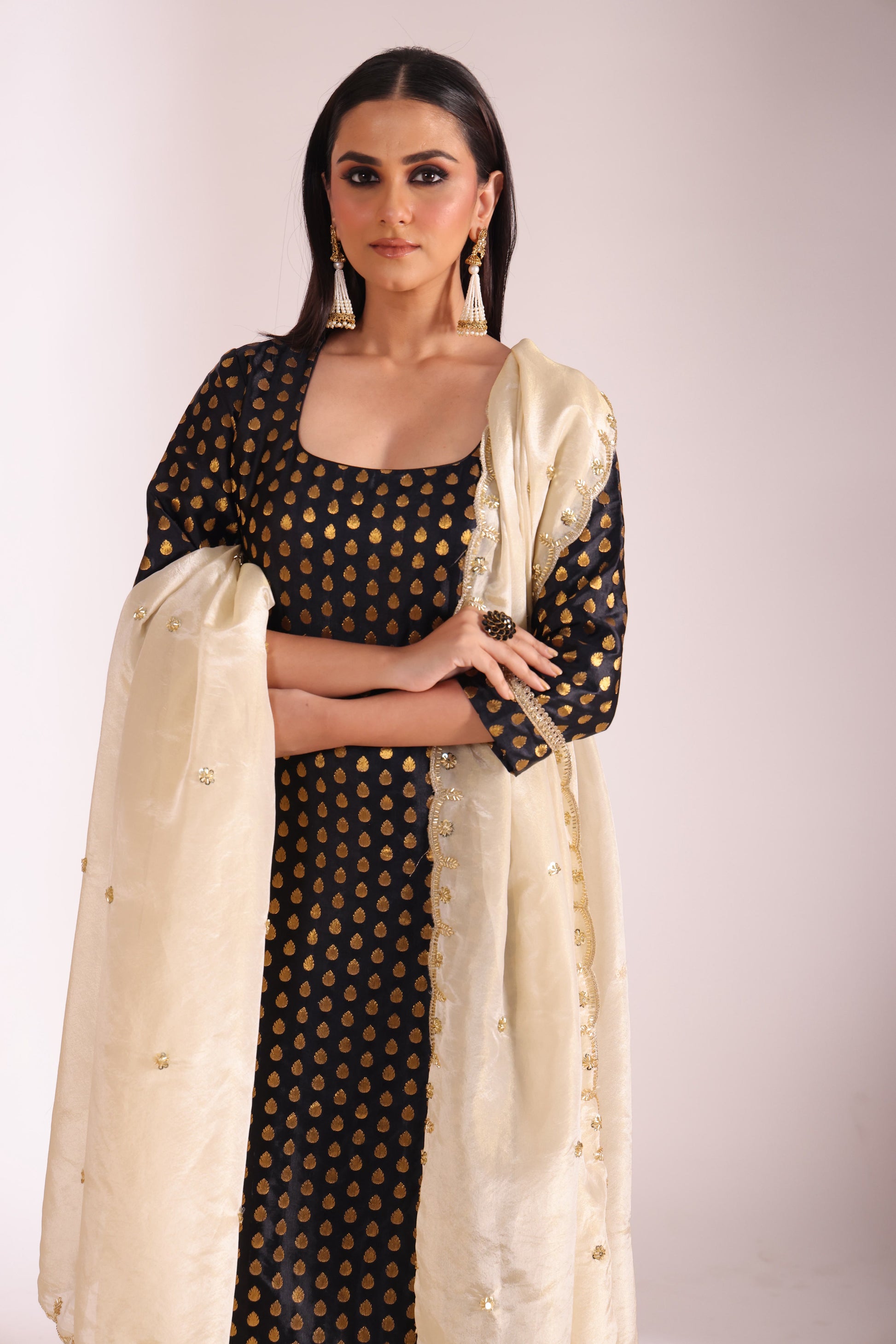 This three piece set includes Kurta, Pant and Dupatta The black silk kurta and pants are adorned with golden motifs, exuding a regal charm. The kurta features a flattering neckline and intricate sequins, gota dori and pearl detailing at the hem and pant cuffs. Paired with a cream tissue silk dupatta highlighted with delicate hand-embellishments and border detailing, this outfit is perfect for festive gatherings or elegant evening occasions. .