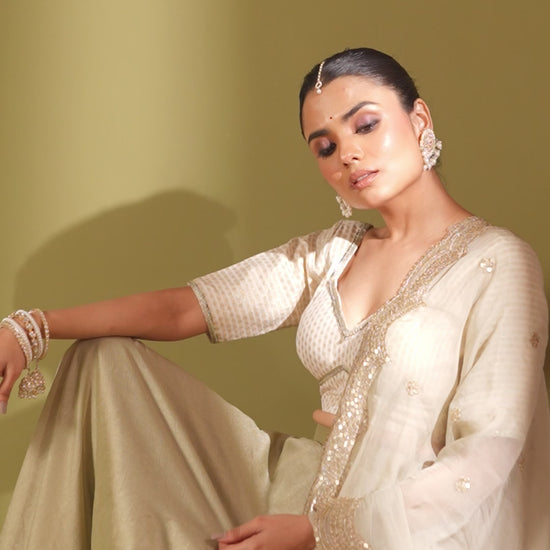 Grace meets grandeur in this ethereal Ivory and sage lehenga set. The structured blouse features intricate work and a flattering sweetheart neckline with elbow-length sleeves. The silk lehenga flows in a rich flare with a gota border for added opulence. Completing the look is a sheer organza dupatta with delicate embroidery and scalloped sequin detailing along the edges, making it a perfect choice for intimate weddings, sangeet nights, or festive soirées.