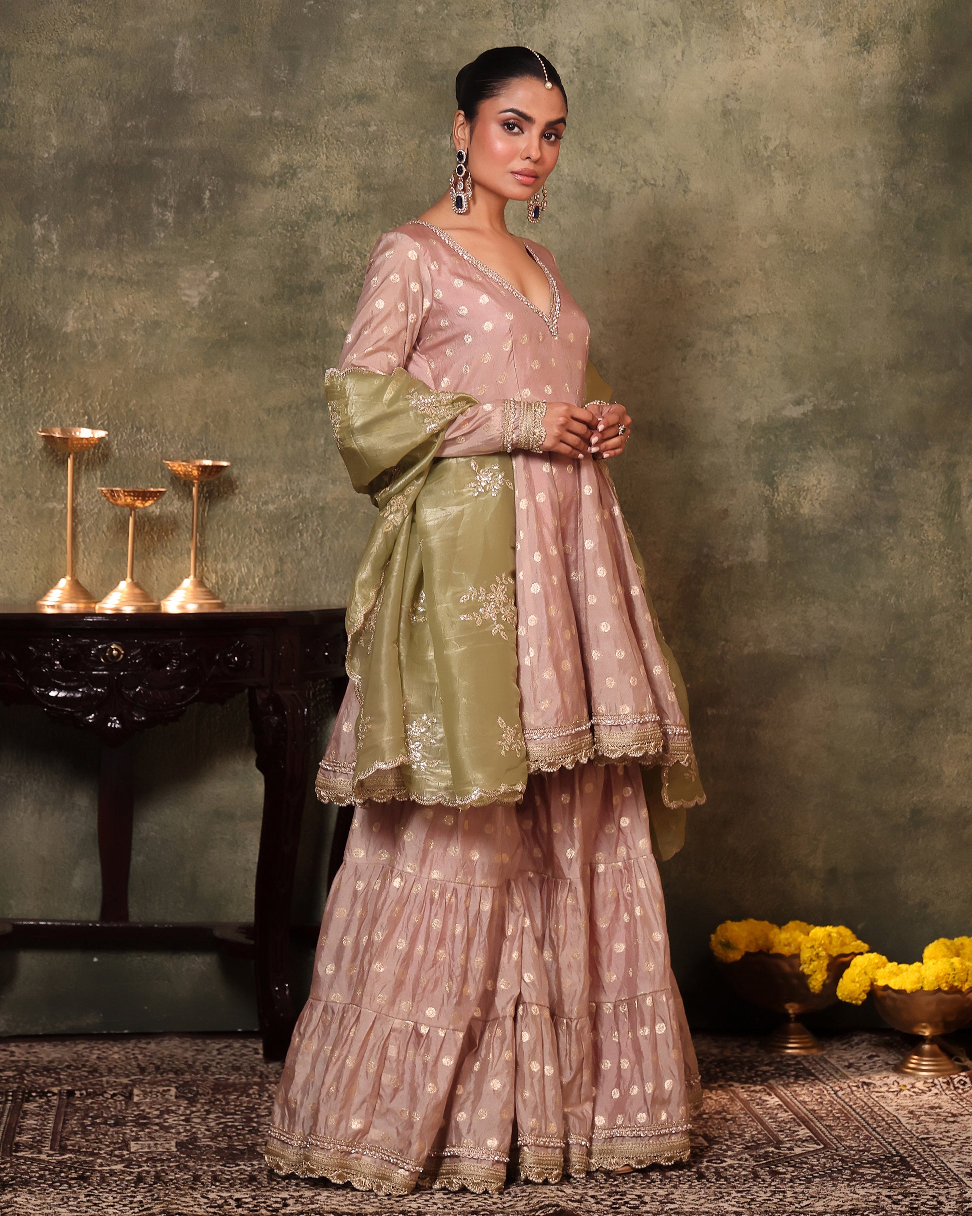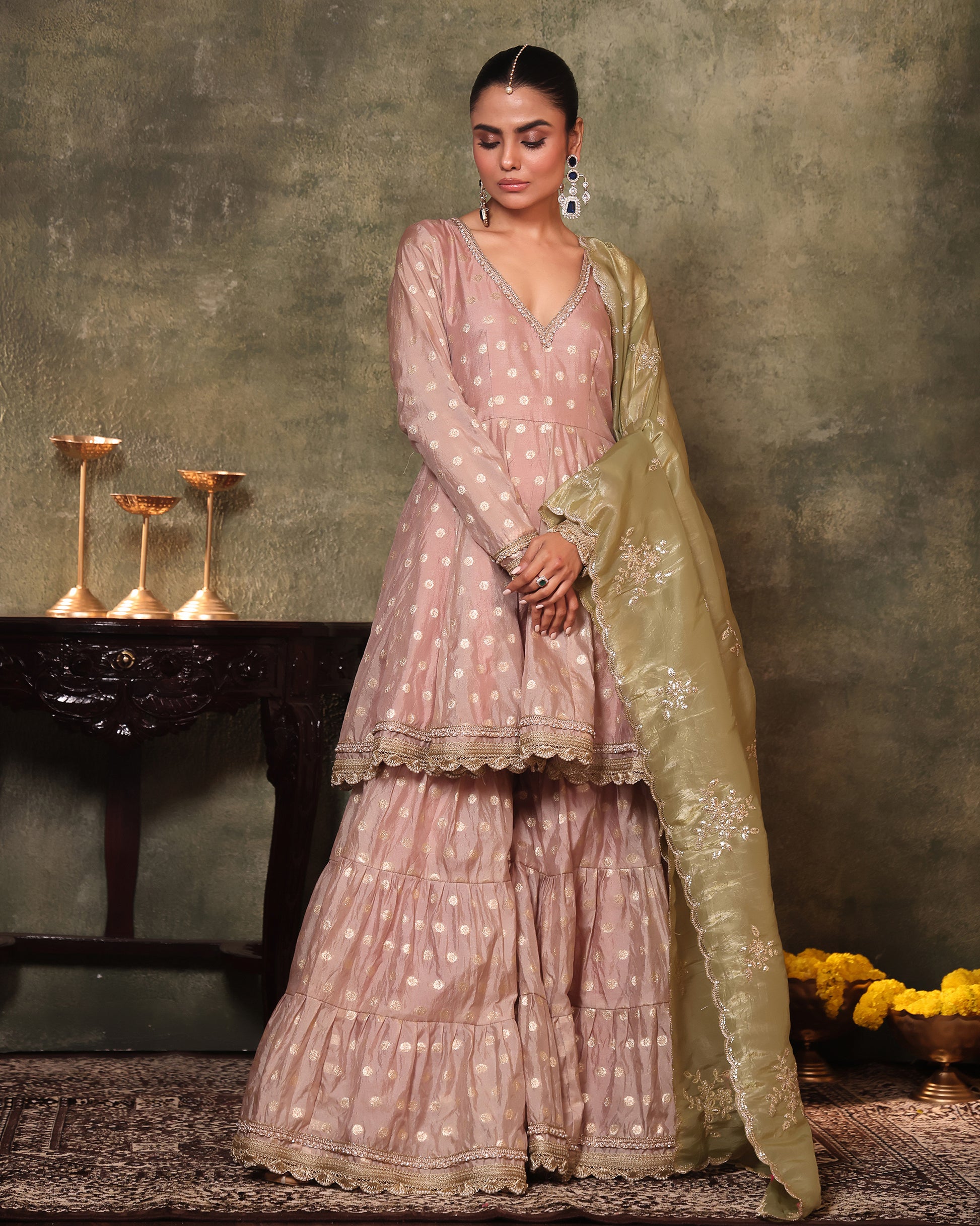 This ethereal kurta sharara set is crafted in a delicate blush pink silk, adorned with subtle all-over woven motifs that add texture and understated shimmer. The kurta features a flattering V-neckline highlighted with fine embroidery, giving the ensemble a refined festive appeal.