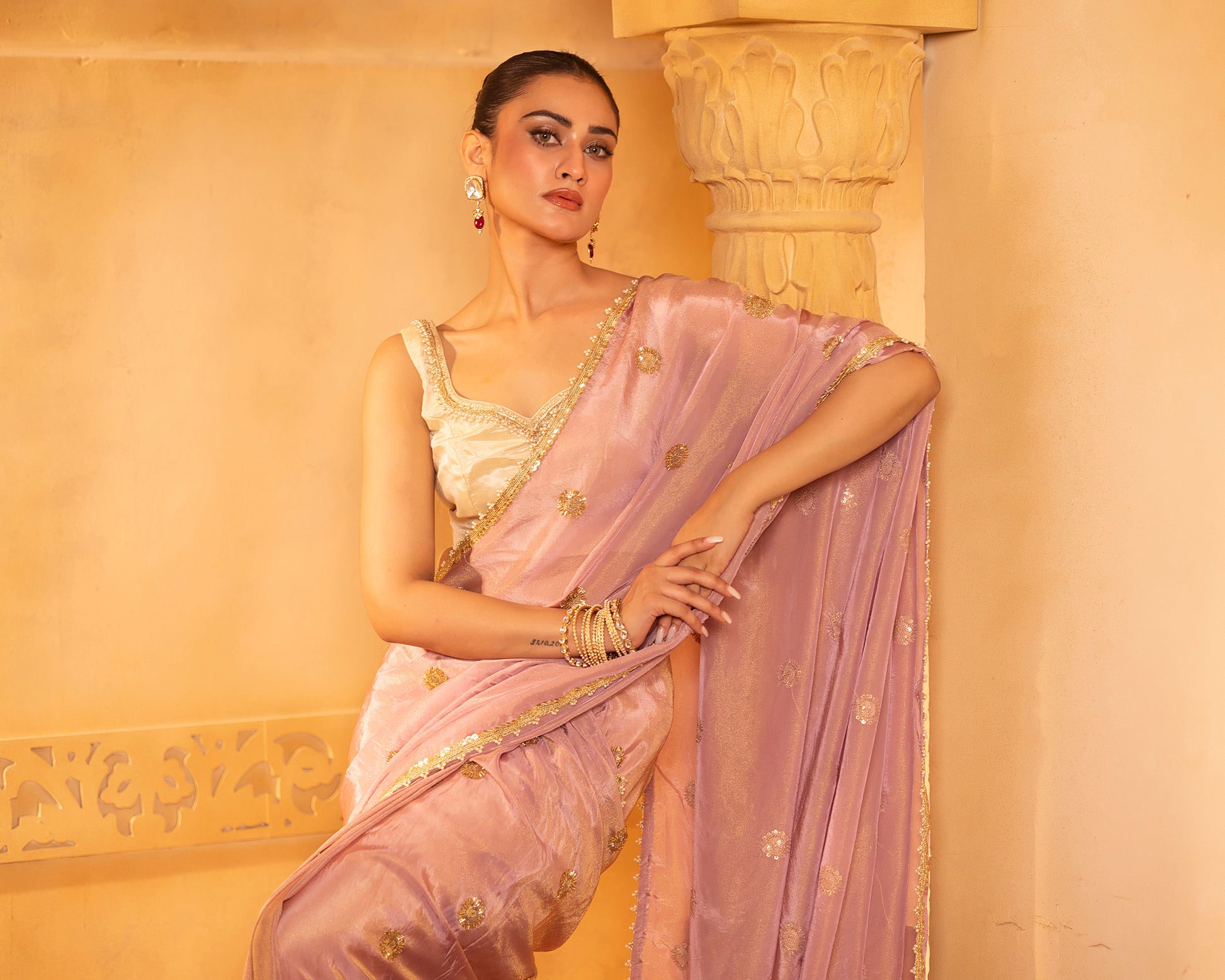 Crafted in luminous tissue silk, this saree showcases a soft, fluid drape with a delicate natural sheen. Subtle gold motifs and an elegantly finished border lend it a refined sparkle, creating a look that feels graceful yet effortlessly luxurious.